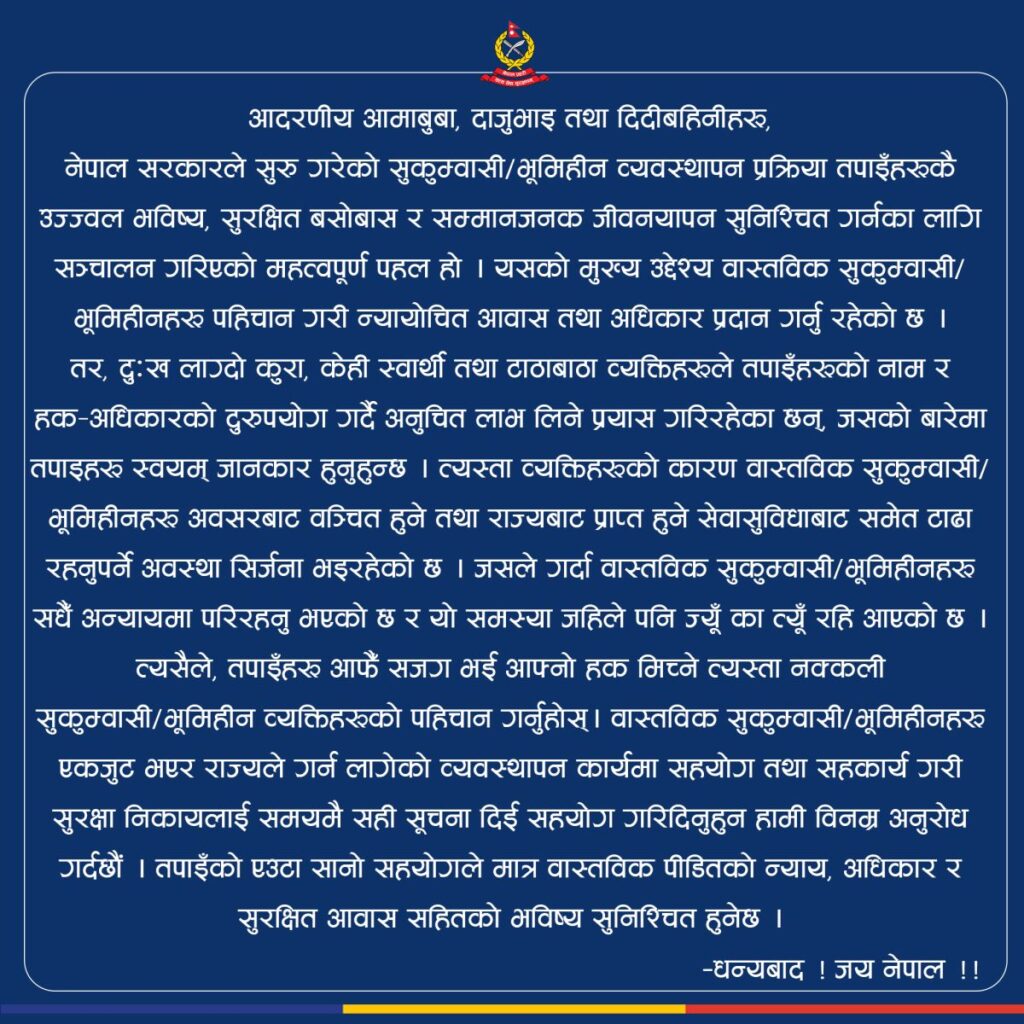 प्रहरीले केही स्वार्थी तथा टाठाबाठा व्यक्तिले वास्तविक सुकुम्वासीको नाम र हकअधिकारको दुरुपयोग गर्दै अनुचित लाभ लिने प्रयास गरिरहेको भन्दै यसमा सचेत हुन आग्रह गरेको छ ।