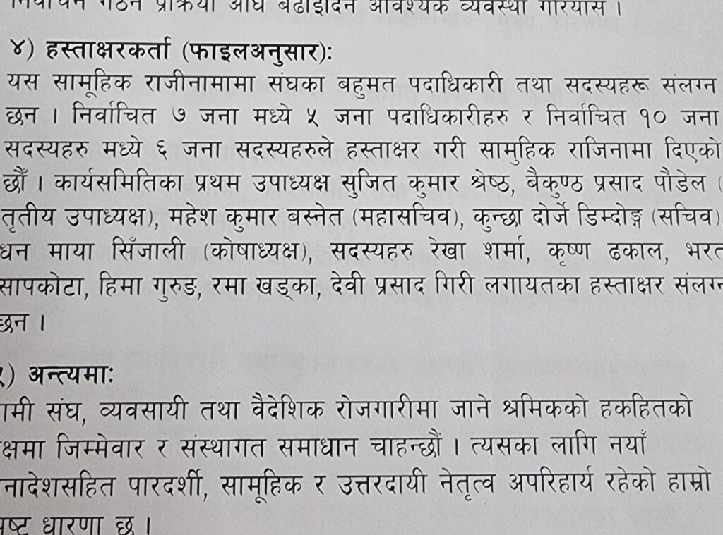 संघका पदाधिकारीसहित ११ जना बहुमत संख्याले राजिनामा दिएको हो । प्रथम उपाध्यक्षमा सुजित कुमार श्रेष्ठ, तृतीय उपाध्यक्षमा बैकुण्ठप्रसाद पौडेल, महासचिवमा महेश कुमार बस्नेत, सचिवमा कुन्छा दोर्जे डिम्दोङ्ग, कोषाध्यक्षमा धनमाया सिजालीले समेत राजिनामा दिएको संघले जनाएको छ ।