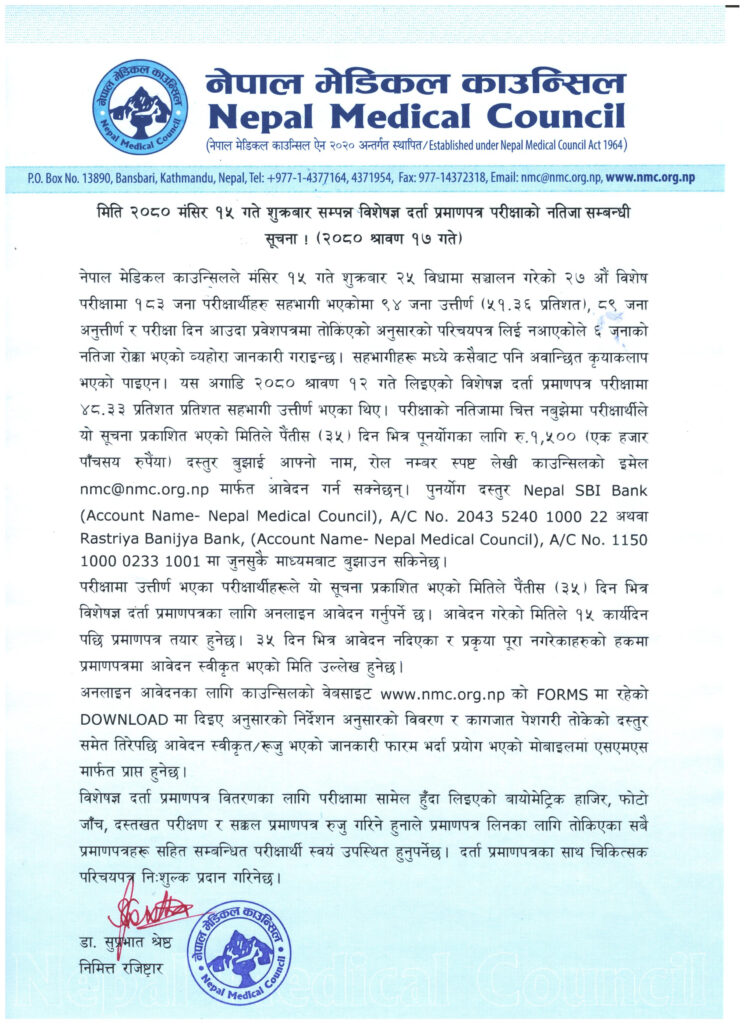 यसअघि साउन १२ गते लिइएको विशेषज्ञ दर्ता प्रमाणपत्र परीक्षामा ४८ दशमलव ३३ प्रतिशत प्रतिशत सहभागी उत्तीर्ण भएका थिए ।