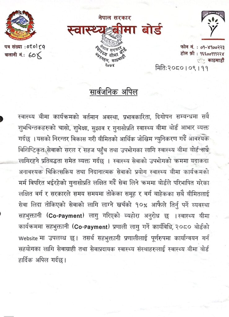 यसअघि बोर्डमा आबद्ध भएकाले कुनै रकम तिर्नु पर्दैनथ्यो । बीमितलाई रु एक लाख बराबरको उपचार खर्च बीमा बोर्डले व्यहोर्ने गर्दछ । उनले अनावश्यक स्वास्थ्य परीक्षणलाई कम गराउन सहभुक्तानी प्रणाली लागू गरिएको बताईन् । “बीमितले अनावश्यकरुपमा स्वास्थ्य परीक्षण गराउन थाले”, उनले भनिन्, “त्यसलाई कम गरेर आवश्यक मात्र स्वास्थ्य परीक्षण गराउन भनेर बिरामीलाई १० प्रतिशत तिराउने निर्णय गरेका हौँ ।” उनका अनुसार सहभुक्तानी प्रणाली आगामी माघ १ गतेदेखि लागू हुनेछ ।