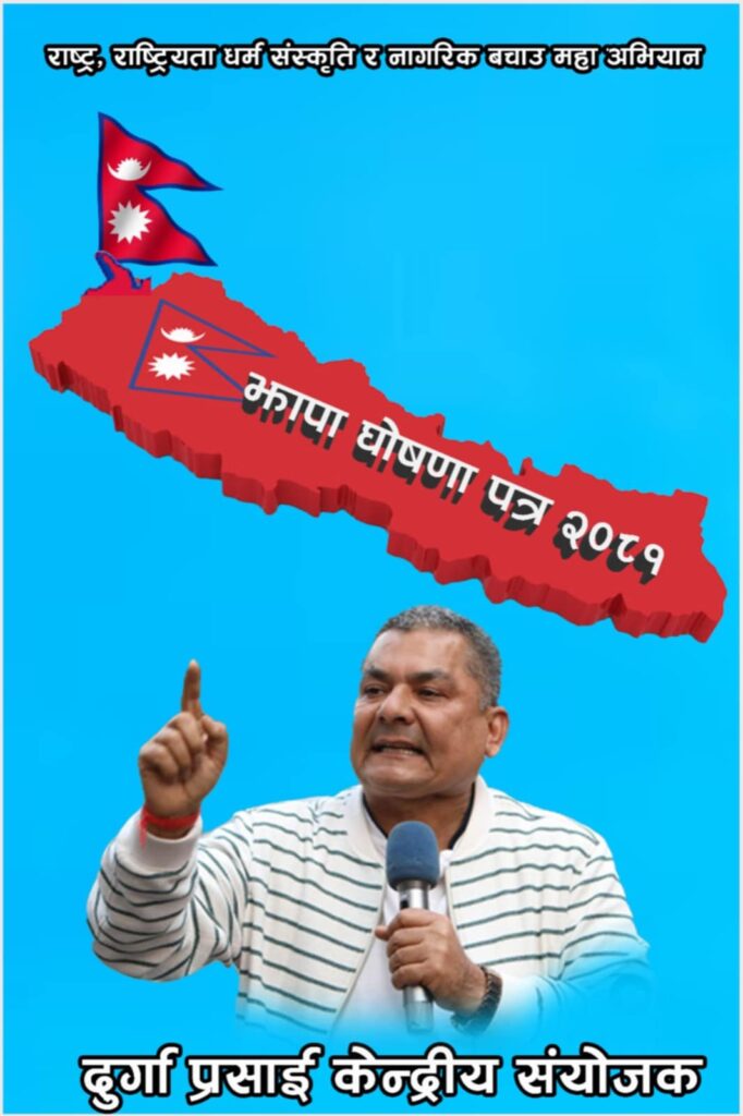 काठमाडौं– मेडिकल व्यवसायी तथा राष्ट्र, राष्ट्रियता, धर्म, संस्कृति र नागरिक बचाउ महाअभियान’ संयोजक दुर्गा प्रसाईले झापा घोषणापत्र जारी गरेका छन् । उनले आफनो घोषणापत्रमा देशको मार्गचित्र, नेपालको भविष्य, कुटनीतिक सम्बन्ध, विकास, स्वास्थ्य, रोजगार, पर्यटन, स्वास्थ्य र अन्य विकासका योजना सार्वजनिक गरेका छन्।