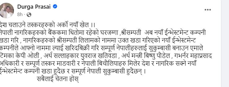 प्रसाईकै भनाइलाई आधार मान्ने हो भने । कसैले १० करोड सम्पति राखेर धितो कर्जा लिएको छ । त्यो सम्पति २–ं३ करोडमा जफत गरी गैह्र बैकिङ सम्पत्ति व्यवस्था भन्दै व्यवस्थापन गरिन्छ । ऋणीबाट जफत गरिएको १० करोडको सम्पति ३ करोडमा लिएर व्यवस्थापन गर्ने भन्दै लुट मच्चाउन खोजिएको उनको आरोप छ । ‘यसरी कर्जा लिएको पैसा जफत गरेर देशमा केही समुहले लट मच्चाउन खाजेको देखियो । यो गलत प्रवृत्ति हो । यस विषयमा सबै जनता सचेत हुनुपर्छ ।’ उनले भने ।
