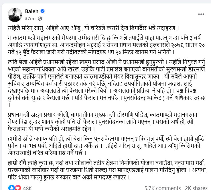 प्रधानमन्त्री केपी शर्मा ओलीले उपत्यका सडक विस्तार पीडित संघर्ष समिति तथा खोला मापदण्ड सरोकार समूह सँग कुरा गर्दै काठमाडौंका नदी किनारबाट थप २० मिटरसम्म संरचना बनाउन नपाइने सर्वोच्च अदालतको फैसलामाथि सरकार छिट्टै पुनरावलोकन (भ्याकेट) मा जाने भनेको केही दिनमा बालेन शाहको स्टाटसले नयाँ तरंग ल्याएको छ ।