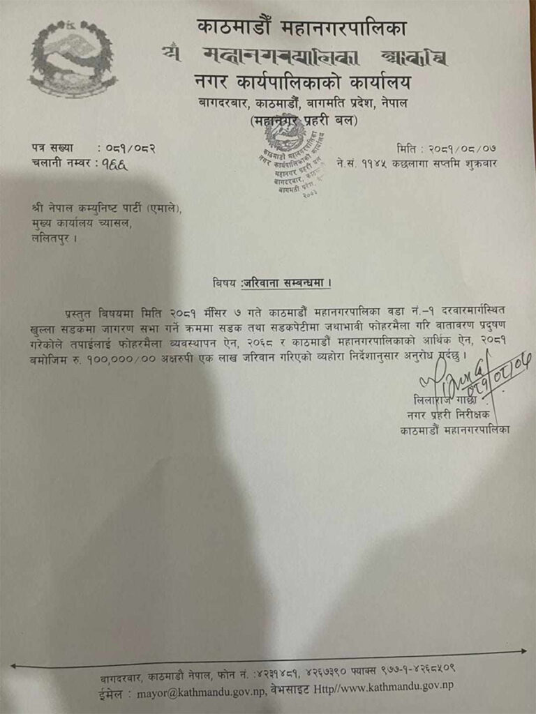 ‘दरबारमार्ग स्थिति खुल्ला सडकमा जागरण सभा गर्ने क्रममा सडक तथा सडकपेटीमा जथाभावी फोहोरमैला गरि वातावरण प्रदुषण गरेकाले’ जरिवाना गरिएको पत्र लेख्दै महानगरले भनेको छ