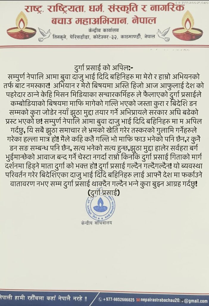 काठमाडौं– नागरिक बचाउ म तथा मेडिकल व्यवसायी तथा नागरिक बचाउ महाअभियानका संयोजक दुर्गा प्रसाईंले प्रधानमन्त्री केपी ओलीविरुद्ध आक्षेप लगाउने गरी ‘प्रमाण’ सार्वजनिक गर्दा गल्ती भएको बयान दिएको केही मिडियामा समाचार आएको थियो ।