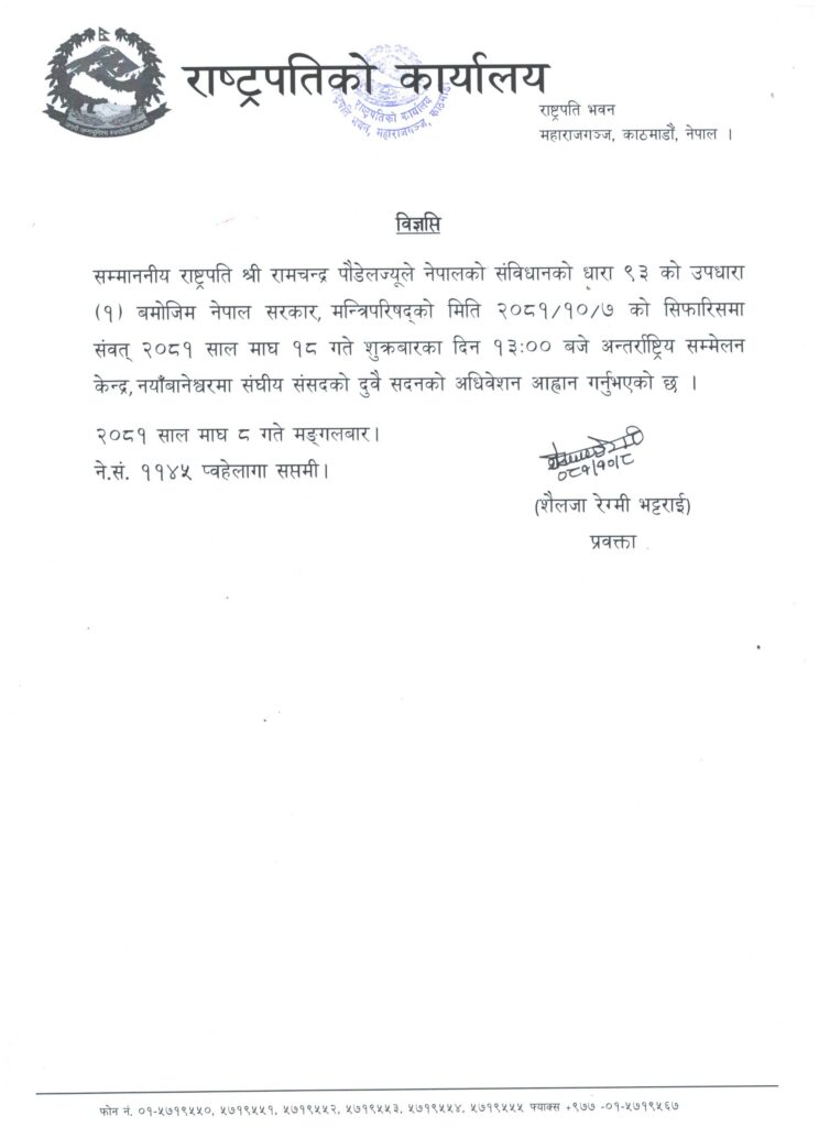 काठमाडौं– राष्ट्रपति रामचन्द्र पौडेलले संघीय संसदको दुवै सदनको अधिवेशन आव्हान गरेका छ्न् ।